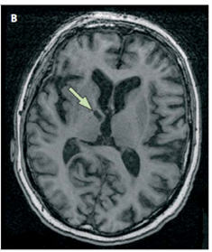 Fig 4 : Petit infarctus cérébral (flèche) lié à l’occlusion d’une petite artère cérébrale